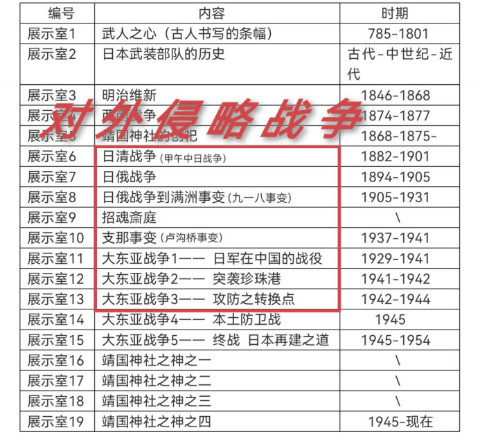 通過上表,我們可以清晰地看出,展示室6-13展出的除「突襲珍珠港」外,其餘的「日清戰爭」(即「甲午戰爭」)、「日俄戰爭」、「滿洲事變」(即「九一八事變」)、「支那事變」(即「盧溝橋事變」)、「日本在中國的戰爭」等戰爭,都發生在中國境內,而且是由日本挑起的。