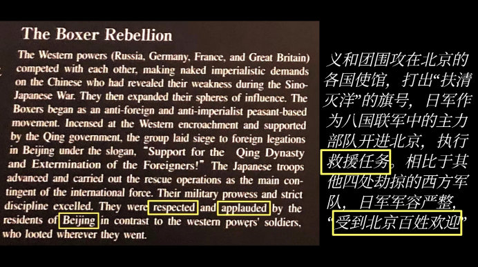 義和團運動的「圖錄」中毫無羞恥地介紹說:義和團圍攻在北京的各國使館,打出「扶清滅洋」的旗號,日軍作為八國聯軍中的主力部隊開進北京,執行救援任務。相比於其他四處劫掠的西方軍隊,日軍軍容嚴整,「受到北京百姓歡迎」……