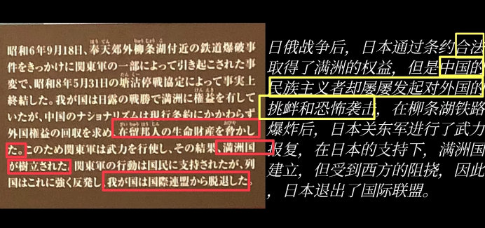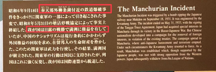 而對於九一八事件的起因,「圖錄」裏寫道:「日本在日俄戰爭後,通過條約合法取得了滿洲的權益,但是中國的民族主義者卻屢屢發起對外國的挑釁和恐怖襲擊,在柳條湖鐵路爆炸後,日本關東軍進行了武力報復,在日本的支持下,滿洲國建立,但受到西方的阻撓,因此,日本退出了國際聯盟。」