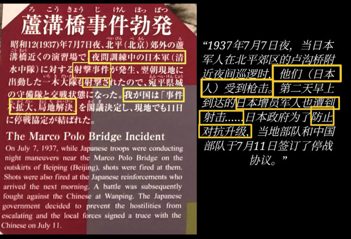 在關於盧溝橋事變的「圖錄」中表示:「1937年7月7日夜,當日本軍人在北平(北京)郊區的盧溝橋附近夜間巡邏時,他們受到槍擊。第二天早上到達的日本增員軍人也遭到射擊。於是對中國人的戰鬥在宛平展開。日本政府為了防止對抗升級,當地部隊和中國部隊於7月11日簽訂了停戰協議。」
