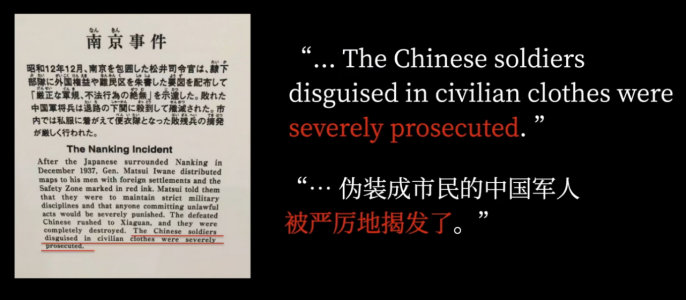 在關於南京大屠殺的「圖錄」中說,「1937年日軍包圍南京後……戰敗的中國兵士涌到下關,他們被完全擊潰。偽裝穿着平民衣服的中國殘兵被揭發了。」