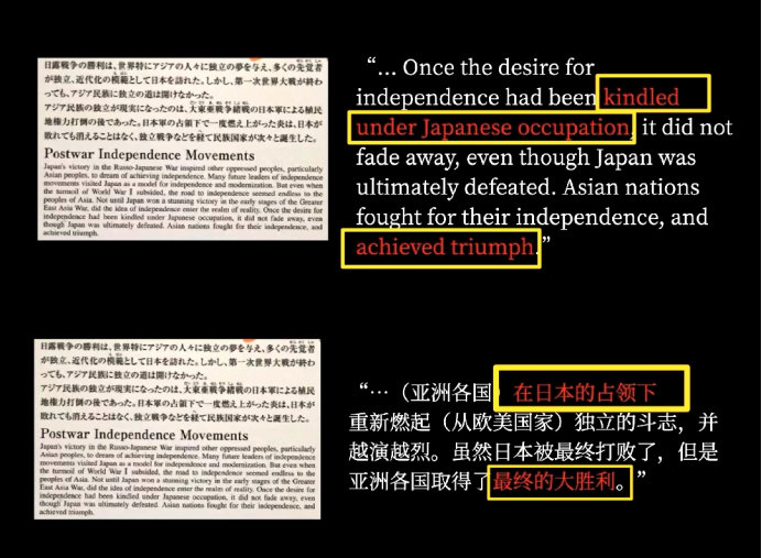 在「二戰後的各國獨立」這一「圖錄」中提到:「……亞洲各國在日本的佔領下,重新燃起獨立的鬥志,雖然日本敗了,但是亞洲各國取得了最終的勝利。」