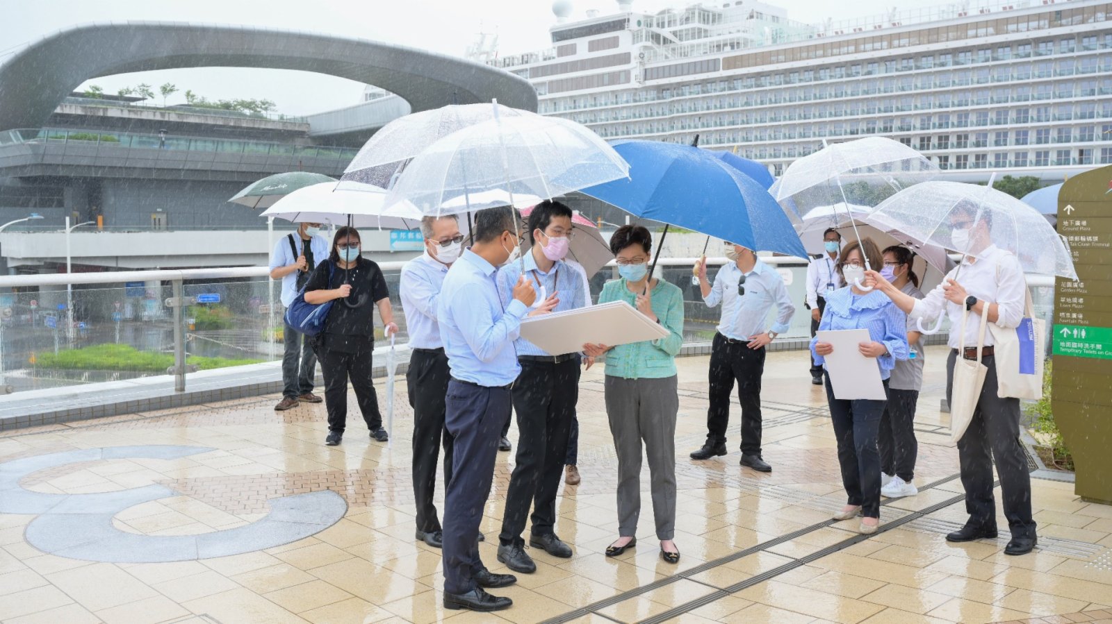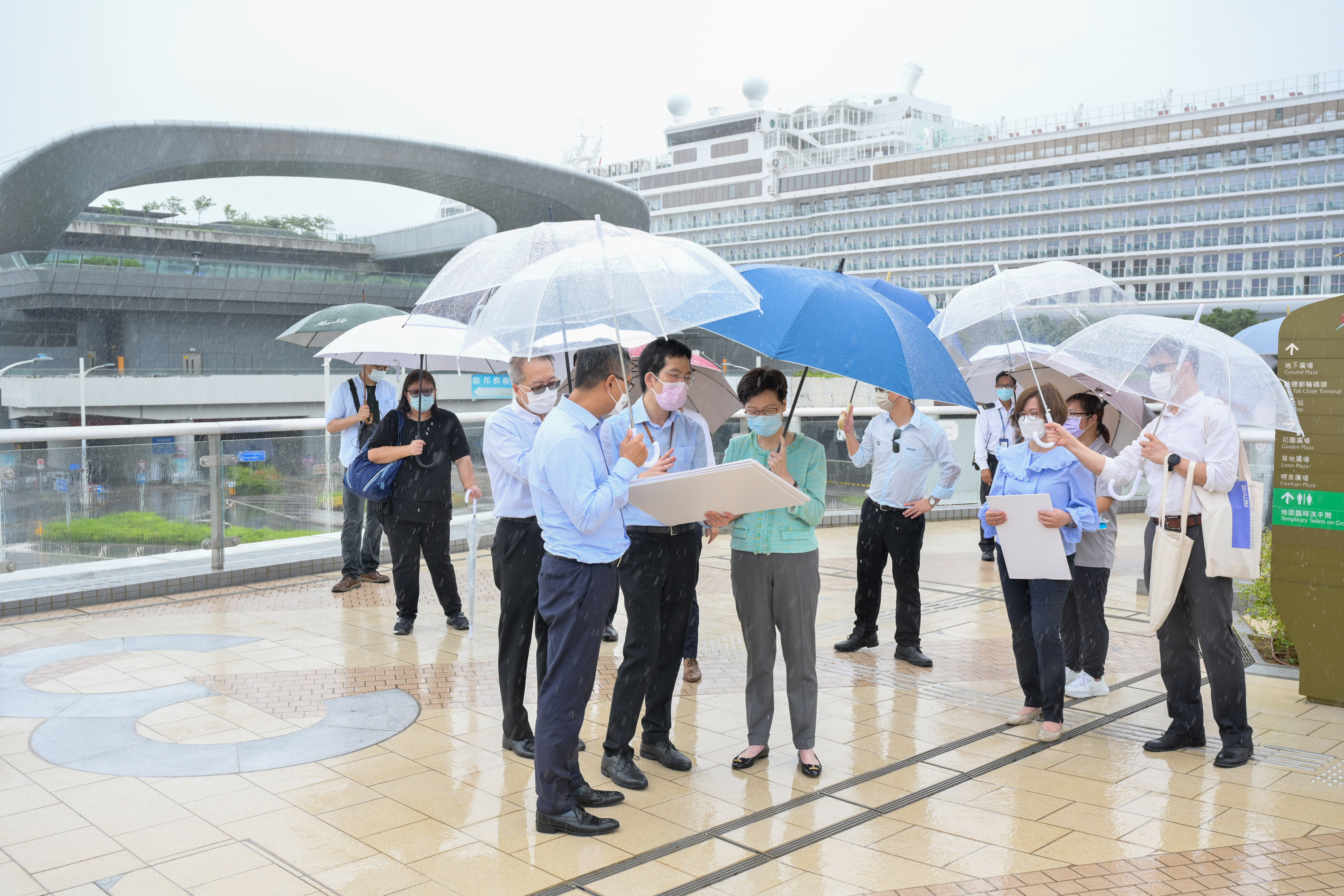 隨後,林鄭月娥在發展局局長黃偉綸和土木工程拓展署署長劉俊傑陪同下,到建於啟德前跑道的啟德空中花園參觀。林鄭月娥其後與黃偉綸和渠務署署長彭雅妮視察啟德河,聽取啟德河改善工程如何提升河道排洪能力以及為河道注入的綠化和生態元素。