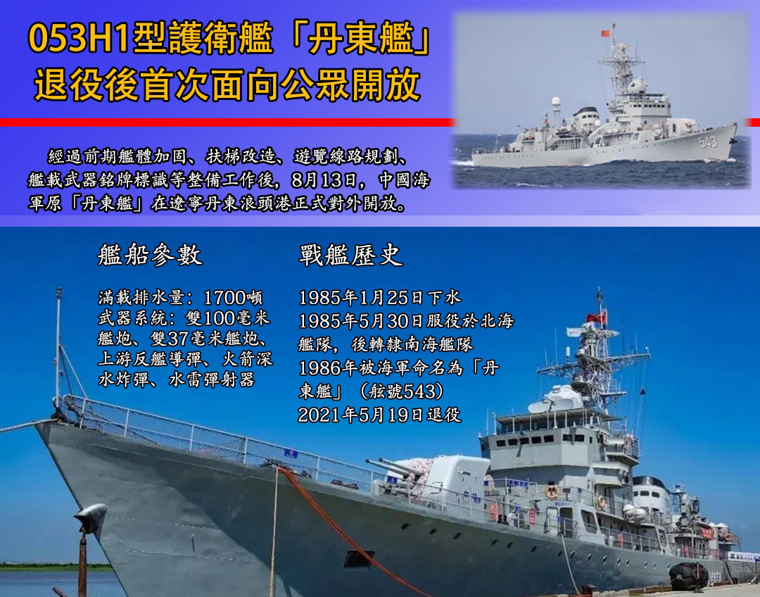 大公文匯全媒體報道:目前停泊於遼寧丹東的053H1型導彈護衛艦丹東艦8月13日正式對外開放,遊客必須持有中國國籍才能入場參觀。據了解,丹東艦服役36年來,出色完成了戰備巡邏、海上維權、出國訪問等一系列重大任務,被上級機關授予「不怕苦、不怕累,特別能戰鬥」稱號,譽為「丹東艦精神」。作為20世紀80年代我國自主設計建造的導彈護衛艦,丹東艦艦長103.2米,寬10.8米,高28.06米,平均吃水3.4米,最大航速21節,續航力4000海里,滿載排水量1944噸。雖然已經開放參觀,但目前丹東艦仍在加裝燈光。工程完工後,璀璨燈光映照下的丹東艦將成為浪頭港區一道浪漫夜景。