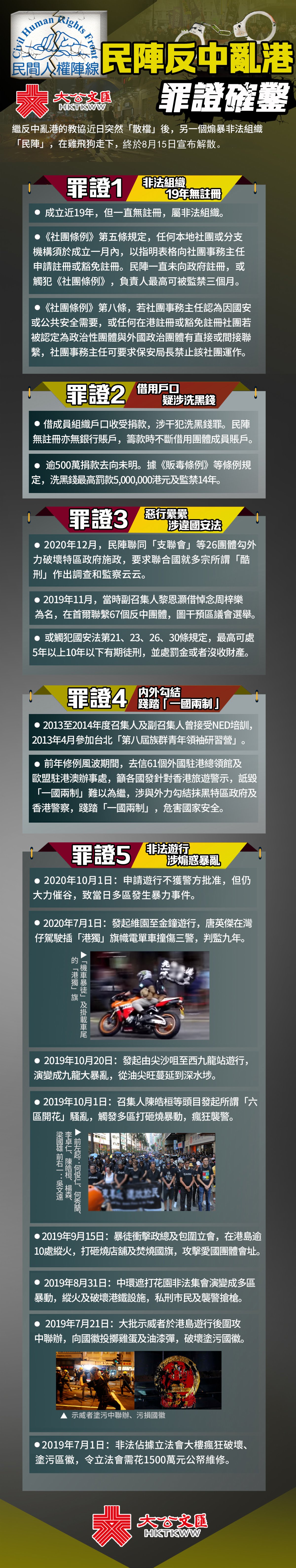 亂港組織「民間人權陣線(民陣)」 今天(15日)中午發聲明宣布解散。聲明指,民陣已於8月13日召開周年大會,出席成員團體一致議決由即日起解散。