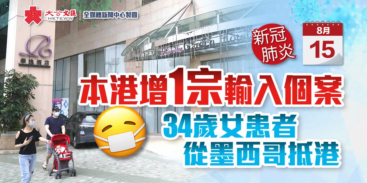 新增患者為1名34歲女子,她無病徵,從墨西哥抵港,住在青衣華逸酒店。另外,過去14天(8月1日至14日)累計報告48宗個案,包括1宗源頭不明本地個案,其餘為輸入個案。