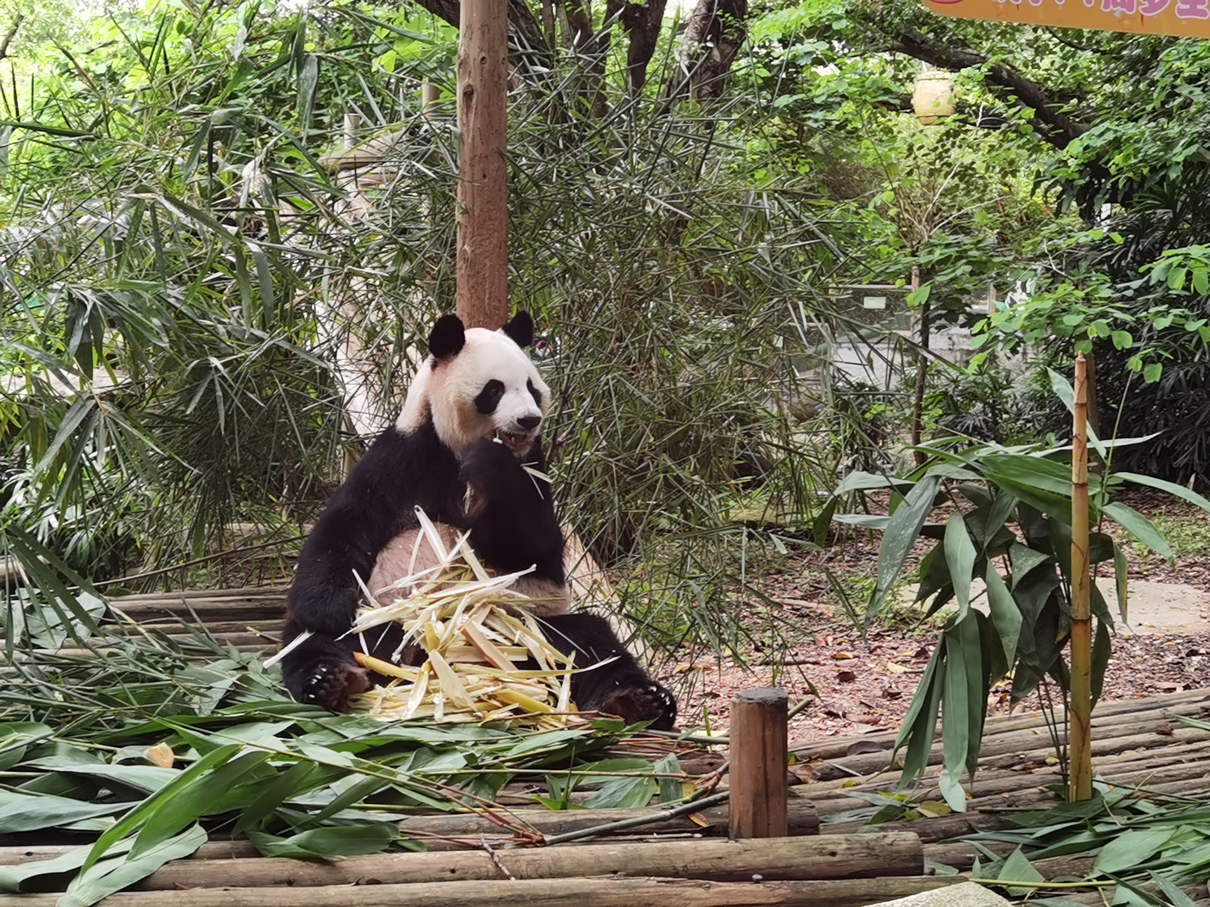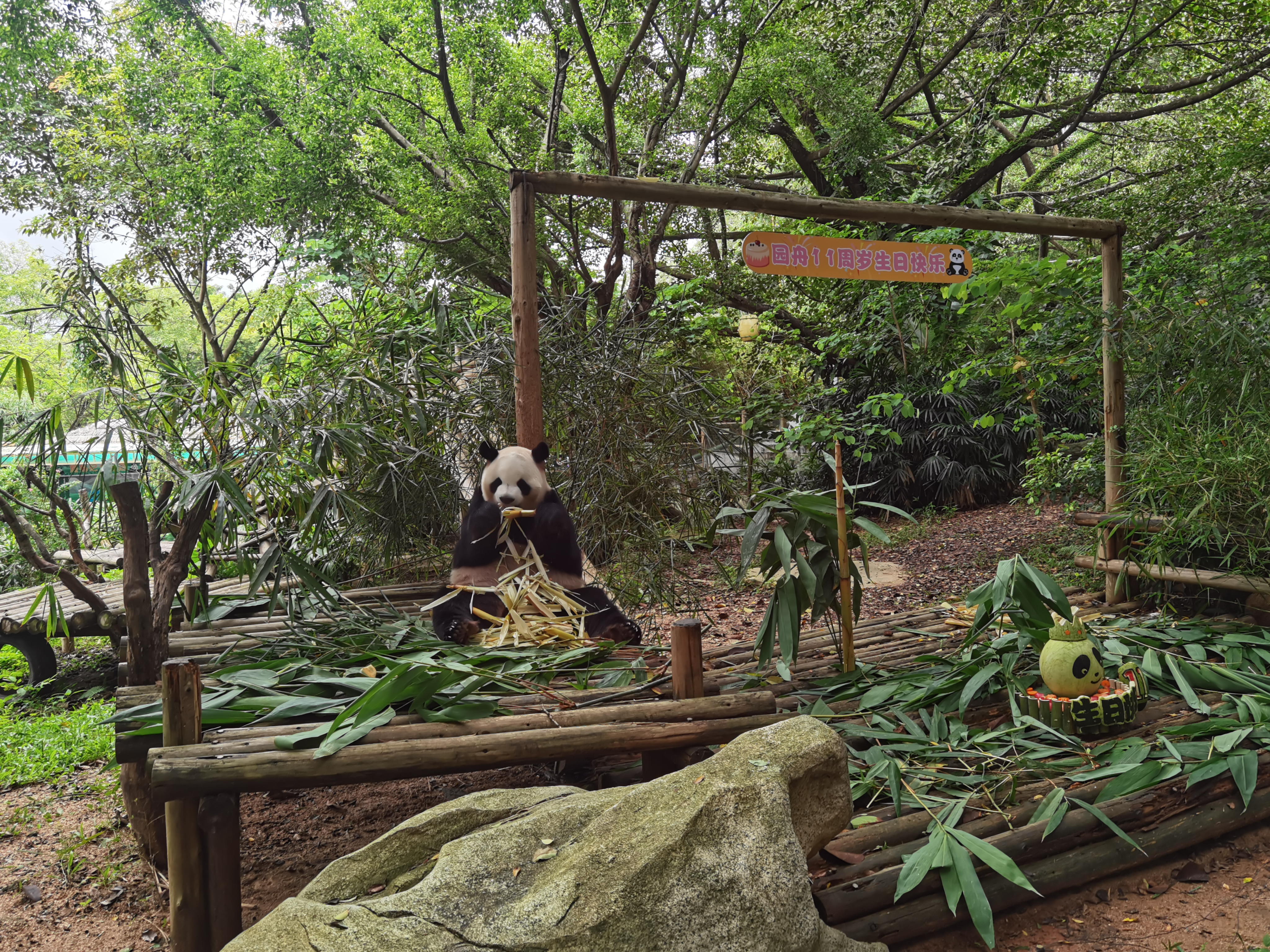大熊貓「園舟」為雄性,2010年08月15日出生於成都大熊貓繁育研究基地,2013年2月6日來到深圳野生動物園生活,正式定居深圳。生日現場,小小宣講員和飼養員一起為觀眾們科普大熊貓的知識,講解了大熊貓的生活習性、大熊貓的食物、大熊貓的手指骨骼、大熊貓的糞便等等。為了獲得所需的營養,大熊貓每天吃掉上百斤的食物,最喜歡食用新鮮的竹筍。同時排出20千克左右糞便,維持新陳代謝的平衡,如果把這些糞便很好的回收利用,可以變廢為寶。