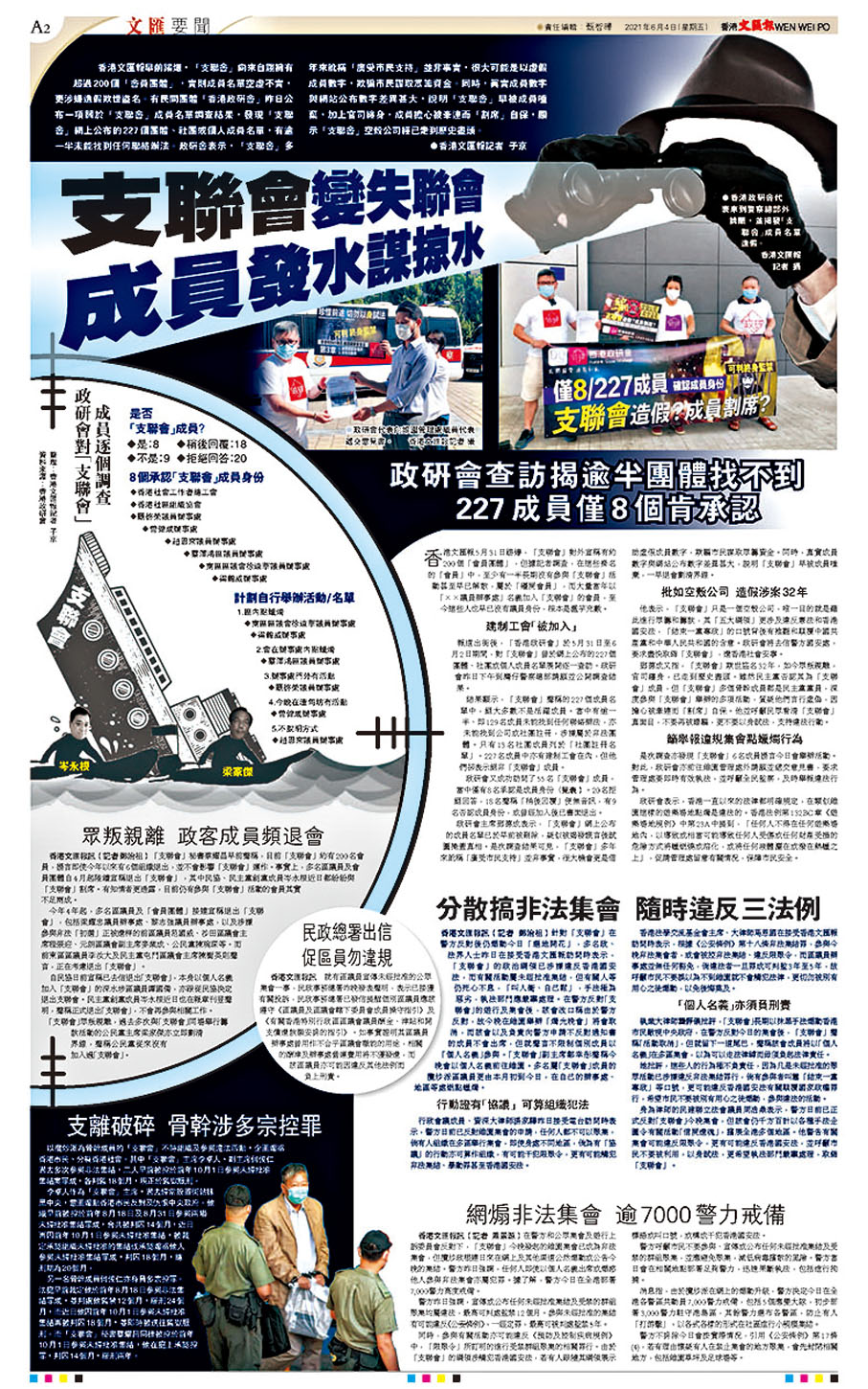 今年,儘管警方反對,「支聯會」仍一再煽動市民於6月4日到維園進行非法集會,其後更煽動要大家「遍地開花」,鄒幸彤亦因此被捕,被控煽惑非法集結。事實上,以攬炒派為骨幹成員的「支聯會」經常組織及參與違法活動,企圖煽惑香港市民、分裂香港社會。其中李卓人、何俊仁過去多次參與非法集結。兩人早前被控於前年10月1日參與未經批准集結案罪成,各判監18個月,現正於監獄服刑。