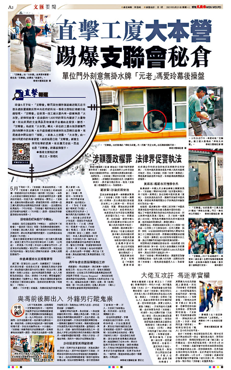 今年5月,香港文匯報記者發現「O姐」馮愛玲等人頻頻出入葵涌某工廠大廈的神秘倉庫,為避免曝光,該倉庫所在的工廠水牌及樓層門牌均無顯示其名稱。當時,倉庫裏面擺放了「支聯會」大部分的物資,包括各式文宣、揚聲器及「民主女神」石膏像等,相信是為六月的「年度騷」所準備。這些物資不會直接被運往「支聯會」的街站或遊行集會現場,而是首先經過「支聯會」位於的旺角道的「紀念館」中轉後,方才運往。因此葵涌的倉庫實際還充當了「指揮中心」的角色。而該倉庫的鎖匙、內部設施及物資的調配,均由幹事馮愛玲專門掌管。近日,香港文匯報記者再次到現場觀察,發現倉庫已然重門深鎖。