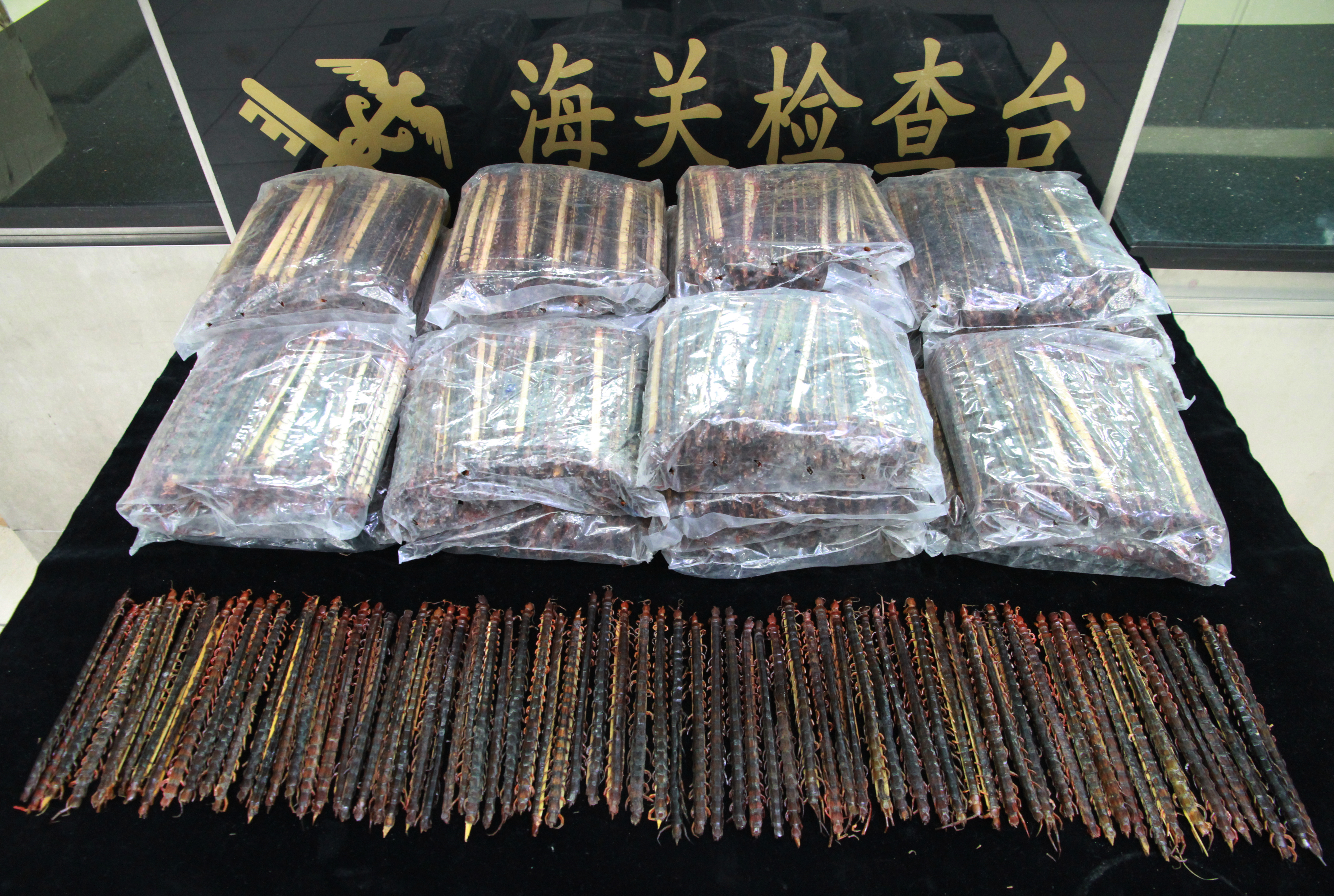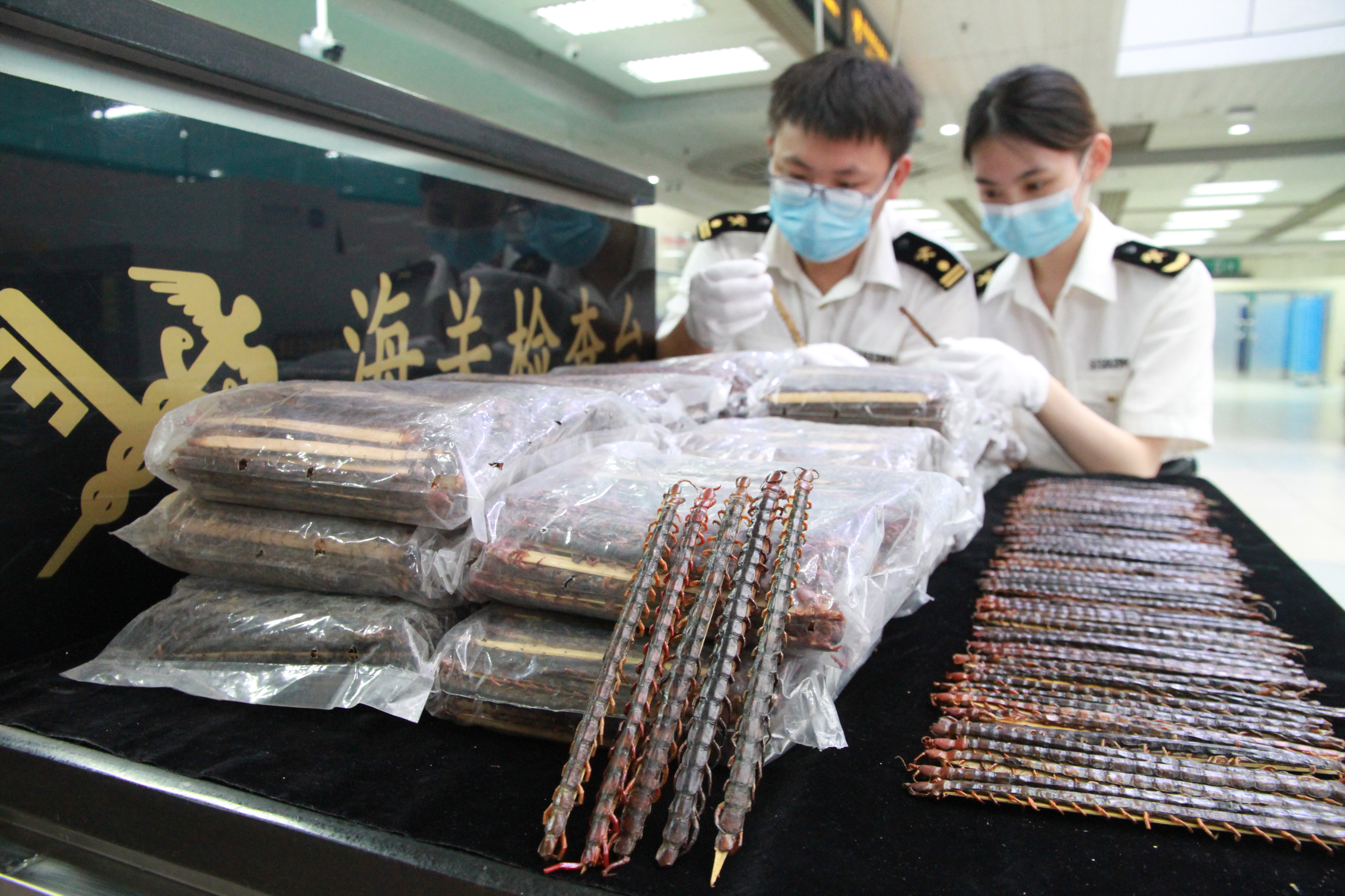7月24日傍晚,內地旅客徐某、王某,澳門旅客梁某先後經拱北口岸旅檢大廳海關「無申報通道」入境。海關人員現場將其截查,分別從其攜帶的行李箱中查獲封裝完好的蜈蚣乾製品,合計約7.8千克。由於旅客無法出具相關證明,海關依法暫扣上述涉案物品並送鑒定。