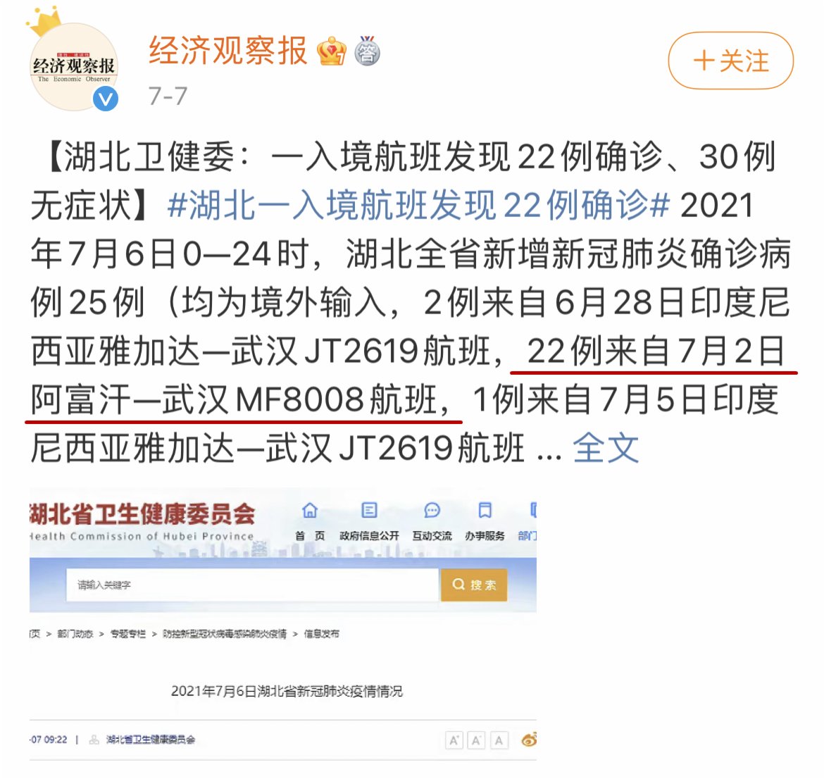 記憶回到今年7月7日,時值國內疫情保持平穩防控狀態時,「湖北一入境飛機發現22例確診病例和30例無症狀感染患者」的新聞,突然讓國內輿論炸了鍋。當時這架從阿富汗到武漢的MF8008航班瞬間成了眾矢之的,被不少網友視為武漢疫情防控的「定時炸彈」。