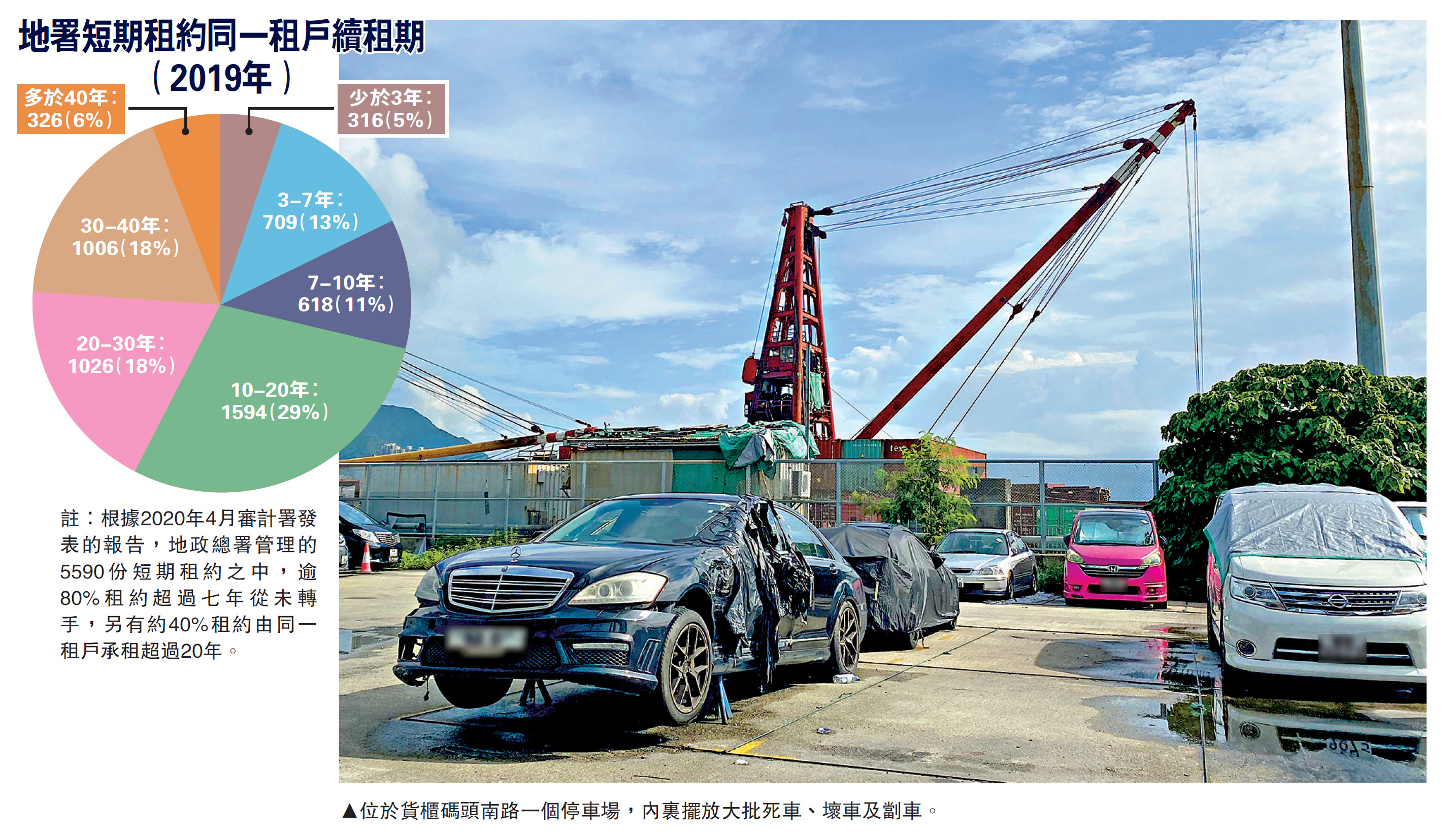 大公報記者日前到多幅葵青貨櫃碼頭的港口後勤用地察看,原作支援碼頭運作的後勤用地,變成停泊私家車及擺放死車的露天停車場。其中一幅位於貨櫃碼頭路南路的「大通停車場」,偌大的用地停泊不同款的私家車,部分車位空置,偶爾夾雜幾架貨櫃車拖頭,停車場九成停泊私家車及小型客貨車,與碼頭邊疊起的貨櫃,毫不融合。一名收款亭職員慨嘆,航運業下滑,後勤的貨櫃車少出少入,即使他們的停車場主要做「街外生意」(與貨櫃物流無關的車輛)亦不易做,「做生意就係慘!」記者好奇指車場停泊不少車,看似繁忙,職員道出實情:「呢堆『死車』嚟㗎,泊喺度唔郁㗎」,職員說停泊月租約800元,比鄰近的美孚、荔枝角月租3000元便宜,不少車主長期把行車證已無效的「死車」擺放在此。