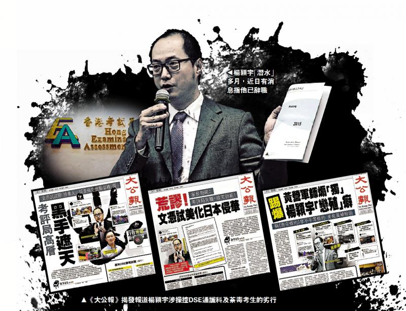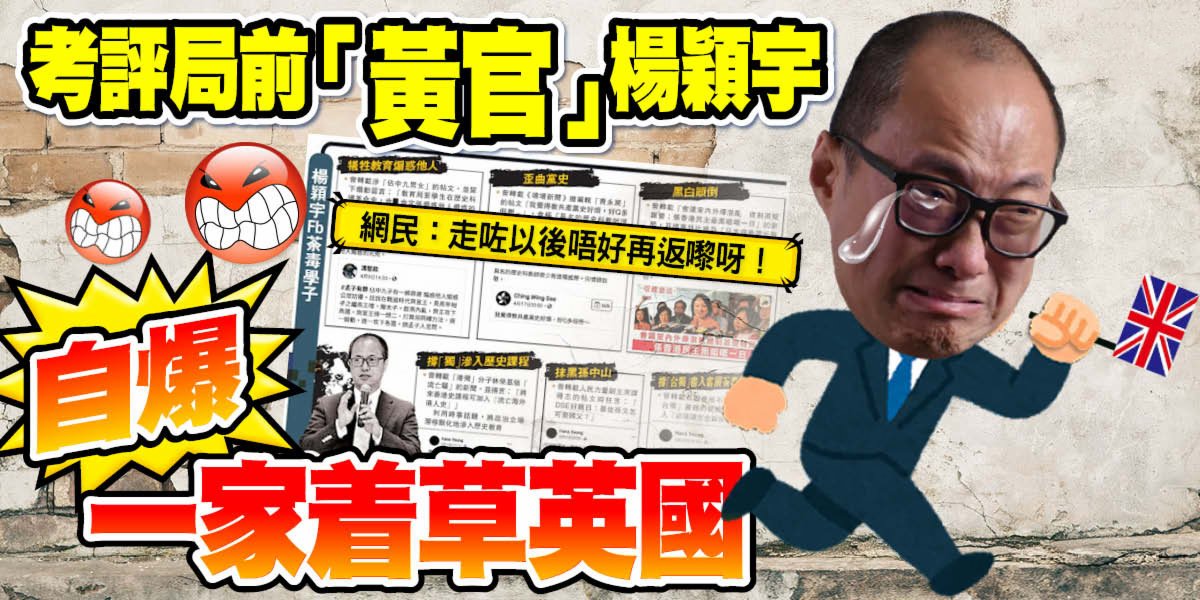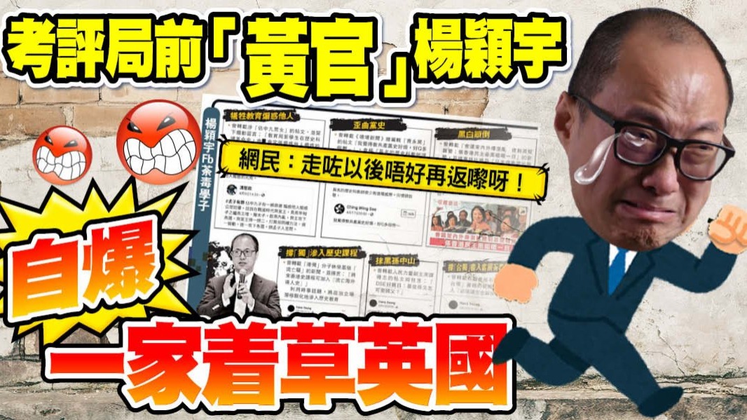 2020年文憑試歷史科出現引導考生評價日本侵華「利多於弊」的冷血試題,引起全城批評,題目最終被取消,負責出題的時任考評局評核發展部經理楊穎宇就辭職卸責。之後,他轉到臭味相投的《蘋果日報》開頻道介紹香港史。《蘋果》執笠後,心虛的他覺得喺香港未必安全,於是決定離港。