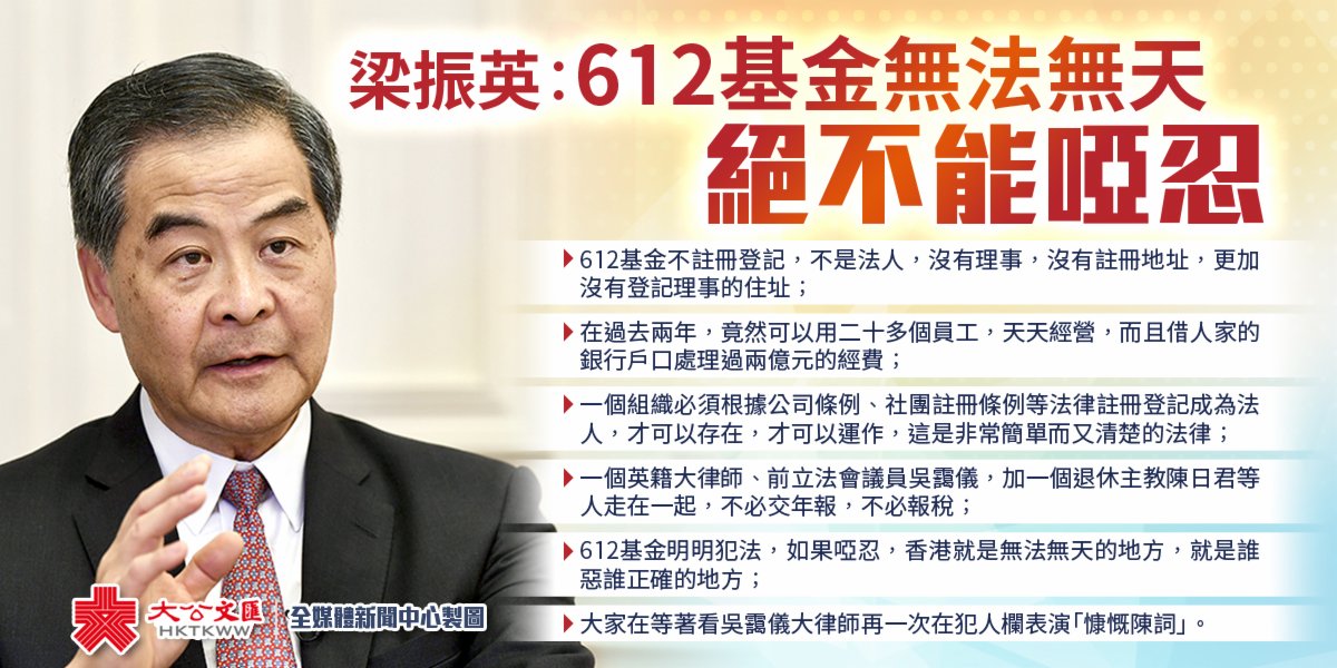大公文匯全媒體報道,修例風波期間深度參與黑暴犯罪活動、大肆鼓動支持煽惑資助暴力犯罪行為的「612黑暴基金」昨日宣布擇日散檔。全國政協副主席、香港前行政長官梁振英今日(19日)早上在社交媒體發文指出,「612基金」目無王法,一個組織有沒有犯法,一講事實,二講法律。「612基金」不註冊登記,不是法人,沒有理事,沒有註冊地址,更加沒有登記理事的住址,竟然可以在過去兩年,用二十多個員工,天天經營,而且借人家的銀行戶口處理過兩億元的經費。
