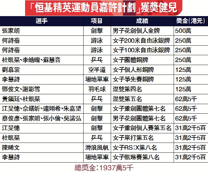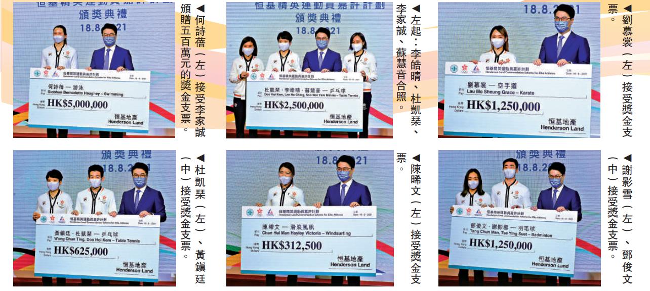 (大公報 記者 張銳)「恒基精英運動員嘉許計劃」頒獎典禮昨午在中環國際金融中心商場舉行,恒基兆業地產集團為18名在東京奧運有出色表現的香港健兒頒發共1937.5萬元獎金。行政長官林鄭月娥感謝中國香港代表團健兒在東奧的出色表現,祝願香港運動員在稍後的東京殘奧會和下月的全運會賽事續創佳績。特首並期望這次嘉許計劃,為商界支持體育發展起示範作用。