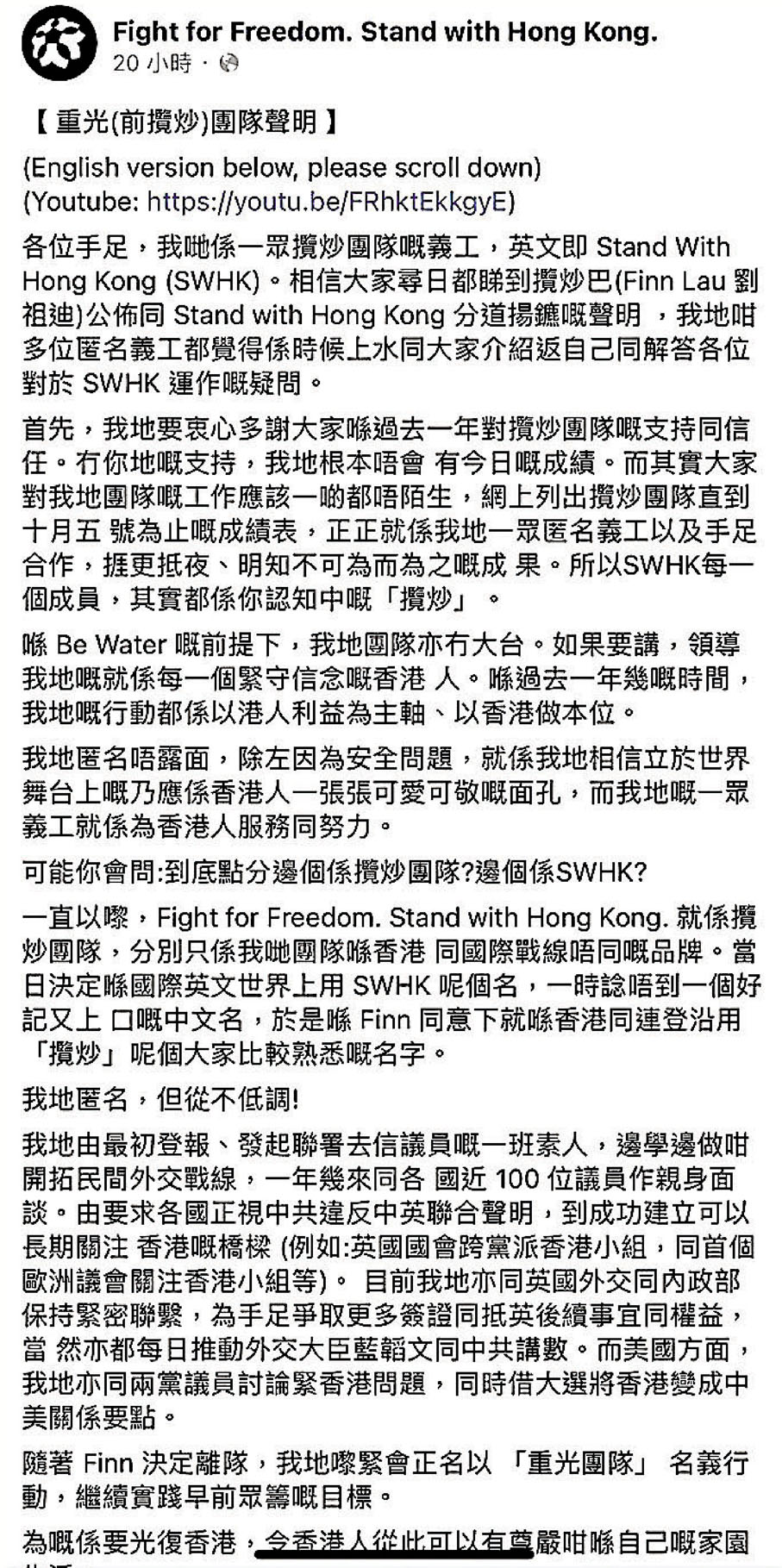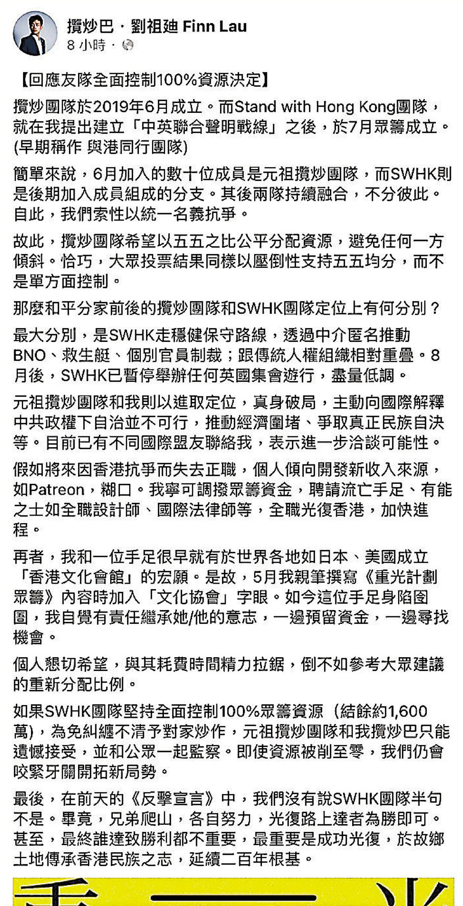 表面是路線之爭,其實是為錢銀反目。劉祖廸稱希望可將之前眾籌所得的1,600萬元「五五分賬」,更在Telegram發起投票,獲逾半網民支持,但攬炒團隊要獨佔鉅款,發聲明拒絕分賬,稱眾籌資金受法律約束,劉若要動用就需按制度申請審核,而團隊更稱會改以「SWHK」名義運作,與劉各行各路。