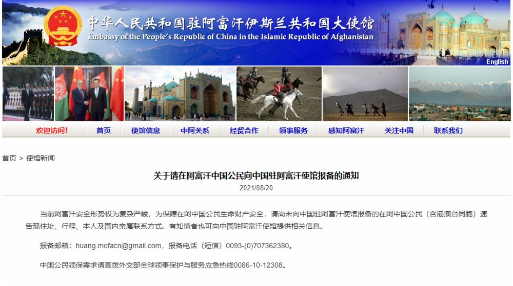 據中國駐阿富汗使館官網消息,當前阿富汗安全形勢極為複雜嚴峻,為保障在阿中國公民生命財產安全,請尚未向中國駐阿富汗使館報備的在阿中國公民(含港澳台同胞)速告現住址、行程、本人及國內親屬聯繫方式。有知情者也可向中國駐阿富汗使館提供相關信息。