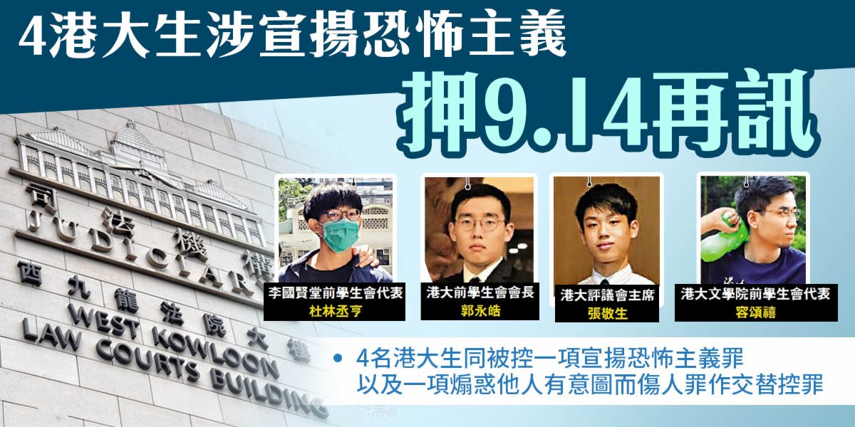 港大學生會評議會上月通過「感激」恐襲刺警兇徒的動議,事件激起公憤,社會各界批評評議會美化恐怖主義。警方國安處周三(18日)上門拘捕4名港大學生,控以一項宣揚恐怖主義罪。4名港大生昨日(19日)被押解到西九龍裁判法院提堂,裁判官拒絕其中3人保釋,批准第四被告容頌禧保釋,控方隨即按《刑事訴訟程序條例》申請覆核保釋裁決,容頌禧須繼續還柙。容頌禧今日(20日)被押解往高等法院,就保釋覆核應訊。國安法指定法官杜麗冰排期至下周五(27日)早上10時半進行保釋覆核聆訊,容頌禧須繼續還柙。