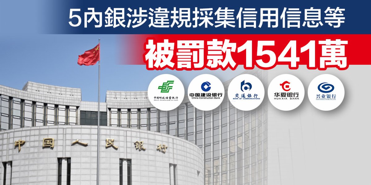 大公文匯全媒體報道,中國人民銀行20日公布5則行政處罰信息,對郵儲銀行、建設銀行、交通銀行、華夏銀行、興業銀行等5家銀行開出罰單,罰款合計1541萬元人民幣。6名責任人員被警告並處罰款合計47萬元。