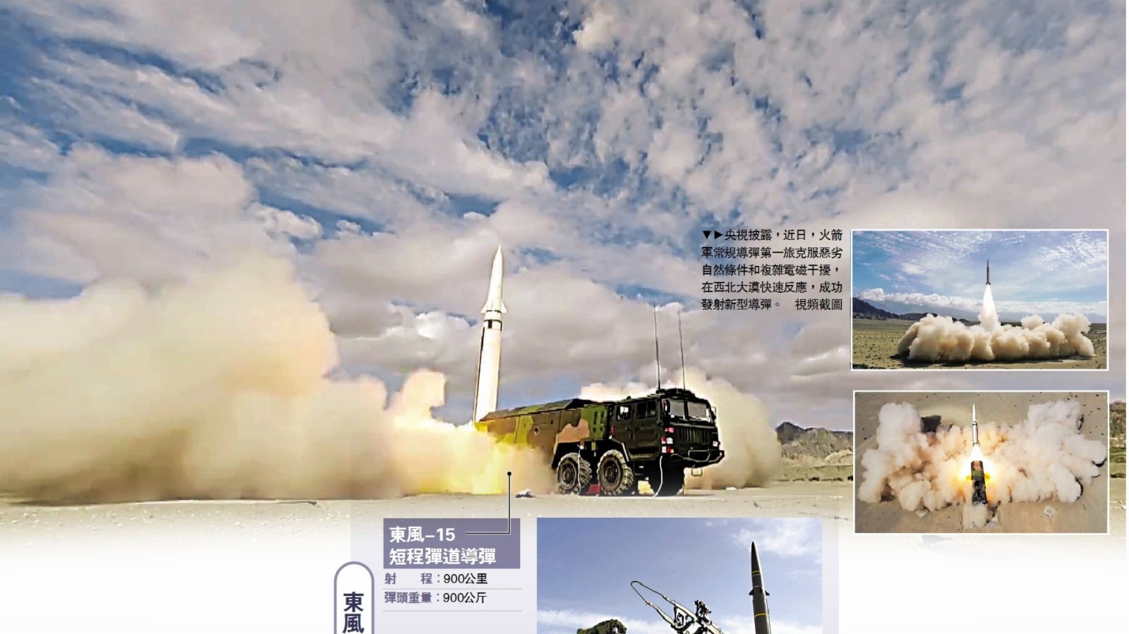 (大公報記者 馬靜、凱雷、馬浩亮北京報道)央視披露,近日,火箭軍常規導彈第一旅克服惡劣自然條件和複雜電磁干擾,在西北大漠快速反應,成功發射兩枚新型導彈,精準命中幾百公里外的藍軍多重防護陣地目標,有效癱毀藍軍防禦體系關鍵信息節點。軍事專家指出,新型導彈幾百公里的射程範圍可覆蓋整個台島,且其換裝的新質彈頭有助實現精準點穴戰,癱瘓敵方的防禦、防空指揮系統和體系。