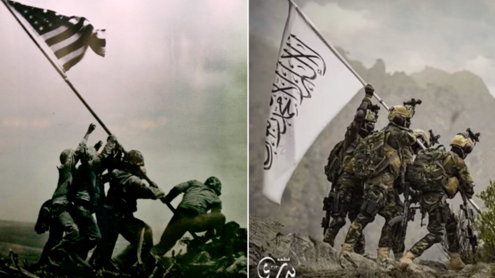 RT報道稱,在這張照片中,塔利班特種部隊「巴德里313」士兵身穿全套迷彩服、防彈衣和戰略,還佩戴了夜視鏡,裝備齊全,似乎重現了1945年硫磺島戰役中,美軍在折缽山上升起美國國旗的那張標誌性照片。