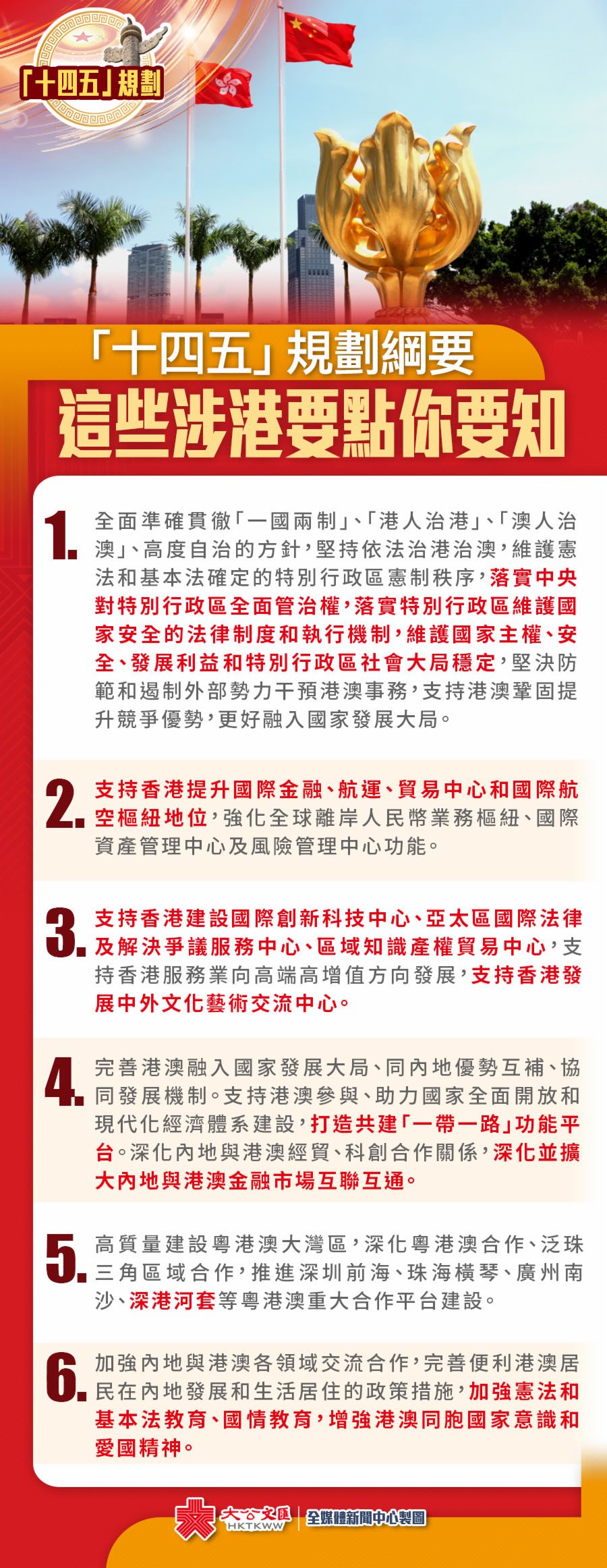 大公文匯全媒體報道,國家「十四五」規劃綱要宣講會明日(23日)上午在香港特區政府總部舉辦,中央宣講團其間將通過多場會議介紹國家「十四五」規劃綱要,以便香港社會各界更好地掌握國家發展戰略和對香港不同範疇的支持。「十四五」規劃綱要有哪些涉港要點?大公文匯全媒體為您整理好了,快來睇下!