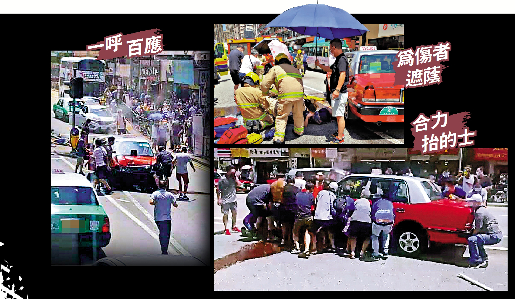 車禍在中午發生,烈日當空,市民打傘為傷者遮擋,更在旁安慰,等待救援人員。多名在附近商店員工對大公報記者說,救人畫面令人感動:「聽到『嘭』一聲,即刻出嚟睇,㗎的士已經停咗,周圍啲人首先好驚慌散開,但好快就有人走近傷者幫手救人,仲成架車抬起。救護車都好快嚟到。」