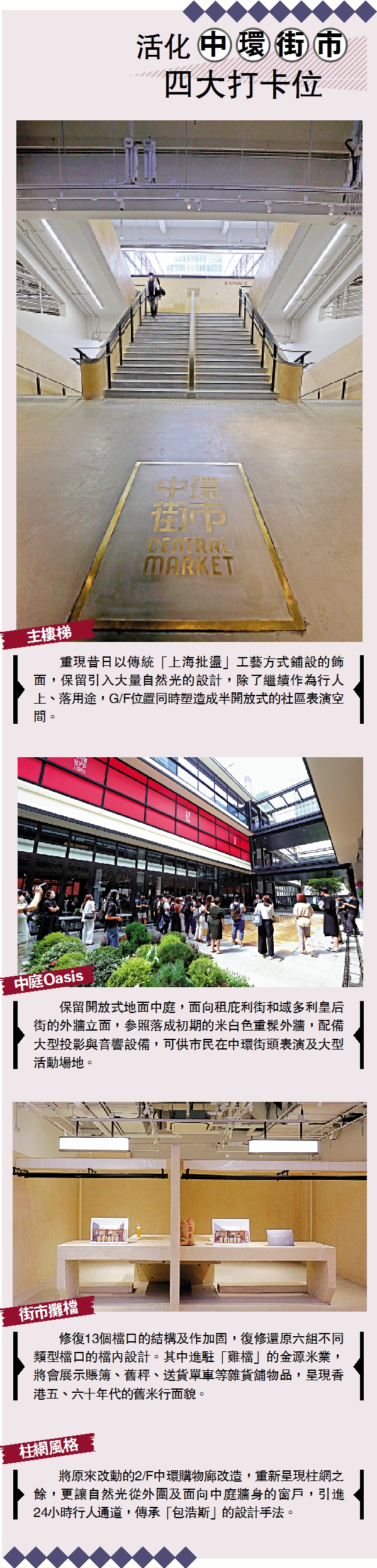 街市給你什麼感覺?濕漉漉,一陣腥味?已有80高齡的中環街市復修前,檔口的確日久失修,天花滲水、批盪剝落;但華麗變身後,提供四萬平方呎休閒用地。市區重建局規劃及設計總監區俊豪表示,中環街市復修難度及保育幅度高,保留的部分原有設計,包括昔日的開放式中庭、主樓梯的傳統上海批盪工藝,和復修及保留傳統設計的13個原有街市檔口,如海鮮檔的水缸及渠道、家禽檔的砧板與血槽等,以展示昔日街市檔口特色,期望帶出香港歷史文化故事及情懷。