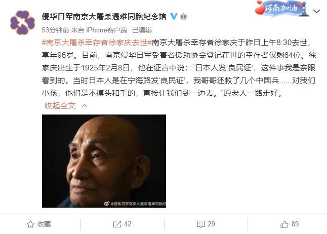 據侵華日軍南京大屠殺遇難同胞紀念館官方微博消息,南京大屠殺倖存者徐家慶於23日上午8:30去世,享年96歲。目前,南京侵華日軍受害者援助協會登記在世的倖存者僅剩64位。