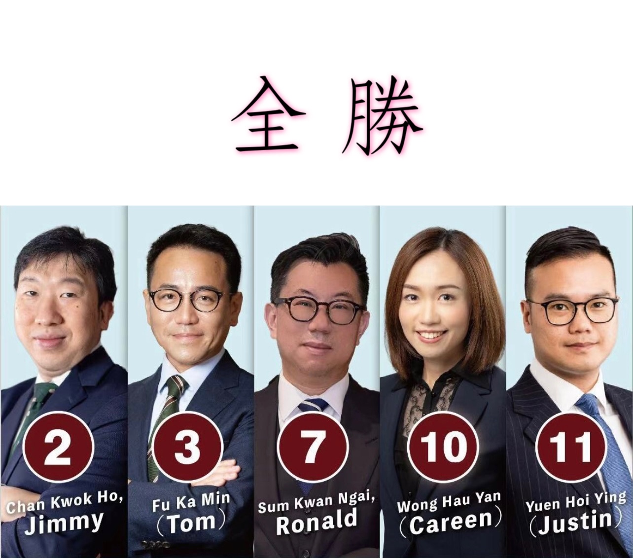香港律師會昨日舉行周年大會暨理事會改選,今日(25日)凌晨公布投票結果,「專業派」5名參選人全部獲勝。當選者為陳國豪、傅嘉綿、黃巧欣、袁凱英、岑君毅。
