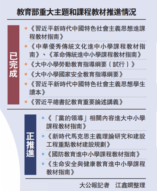 (大公報記者 江鑫嫻北京報道)8月24日,教育部舉行首場2021教育金秋系列發布會。教育部教材局局長田慧生在介紹統籌謀劃重大主題教育進課程教材總體情況時說,以學習貫徹習近平新時代中國特色社會主義思想為主要任務及基本遵循。近日印發《習近平新時代中國特色社會主義思想進課程教材指南》,把馬克思主義中國化最新成果系統納入各級各類學校課程教材。另外,教育部教材局一級巡視員申繼亮在會上表示,為將國家安全教育納入國民教育體系,該部組織研製《大中小學國家安全教育指導綱要》提出,必須多途徑、多措施、多渠道開展國家安全教育,要讓每一個學生樹立國家利益至上觀念。另外,在《綱要》初中階段的國家安全教育知識要點中提到,要了解「台獨」「藏獨」「東突」「港獨」等分裂活動構成的威脅。