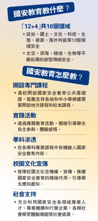 《綱要》提出,大中小學國家安全教育內容實現所有領域全覆蓋,包括「12+4」共16個領域,即政治、國土、文化、科技、生態、資源、海外利益等12個領域安全,以及太空、深海、極地、生物等不斷拓展的新型領域安全。圍繞國家安全各重點領域的重要性、基本內涵、面臨的威脅與挑戰、維護的途徑與方法等提出學習要求。其中,在初中階段的國家安全教育知識要點中提到,反分裂鬥爭形勢依然嚴峻,要了解「台獨」 「藏獨」「東突」「港獨」等分裂活動構成的威脅。