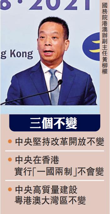 「中央在香港實行『一國兩制』不會變。」黃柳權說,實踐證明,「一國兩制」不僅是解決歷史遺留的香港問題的最佳方案,也是香港保持長期繁榮穩定最佳制度。雖然這幾年「一國兩制」在香港遇到新問題和挑戰,但中央始終堅持「一國兩制」方針不會變、不動搖,並積極採取有效舉措確保「一國兩制」實踐不變形、不走樣。制定香港國安法和完善選舉制度,就是為了堵住法律和制度漏洞,確保香港長期繁榮穩定。香港國安法讓香港營商環境更加穩定,中央支持香港保持自由港和單獨關稅區地位、鞏固提升競爭優勢、保護在港投資者合法權益的一貫政策不變。