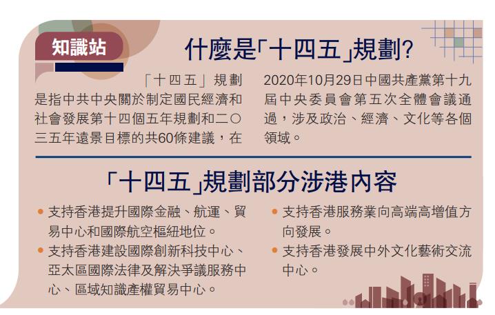 財政司司長陳茂波表示,香港有「一國兩制」的優勢,而「十四五」規劃又進一步明確香港的定位和角色,為香港融入國家發展大局提供了最佳路徑。香港將繼續發揮作為國家國際循環重要節點的功能,同時通過粵港澳大灣區這個最好的切入點,「扣進」內循環,把握日益龐大和對質量要求不斷提升的內地市場,服務國家的同時,實現香港經濟的可持續發展。