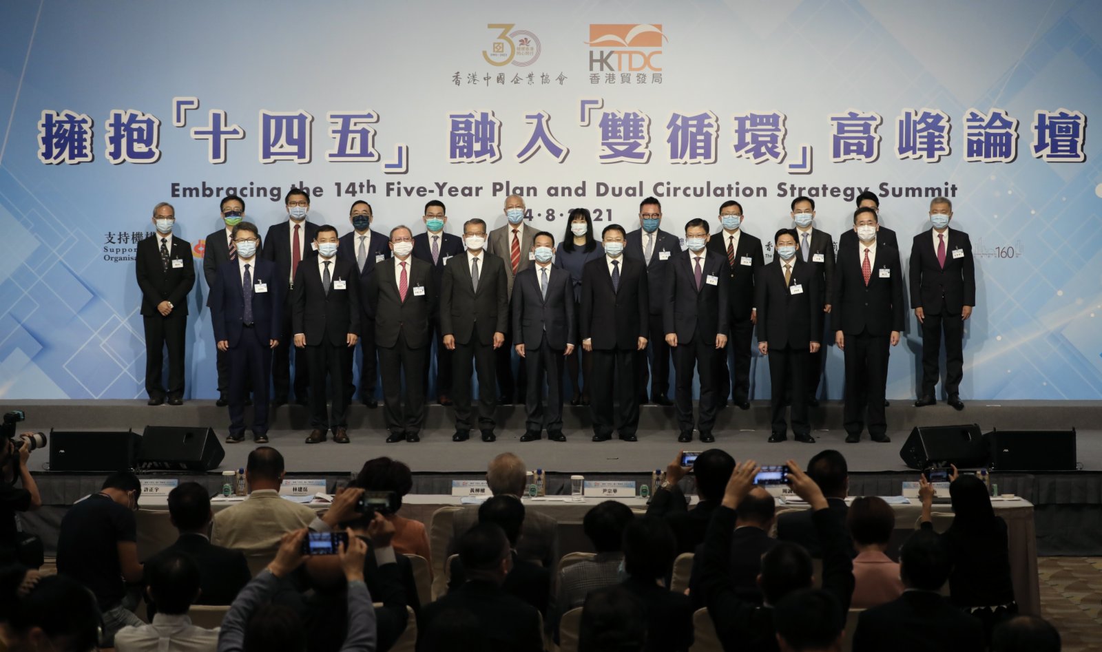 (大公報 記者 龔學鳴)「擁抱『十四五』 融入『雙循環』」高峰論壇昨日在會展中心舉行,是次論壇為國家「十四五」規劃宣講團在港系列宣講活動的重要組成部分,由香港中國企業協會(中企協)和香港貿發局主辦。國務院港澳辦副主任黃柳權、香港中聯辦副主任尹宗華、財政司司長陳茂波、香港中國企業協會名譽會長孫煜、香港貿易發展局主席林建岳等出席論壇。