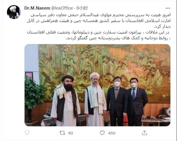 納伊姆分別使用阿拉伯語、普什圖語、波斯語通報了該條短訊。他說,由阿塔高級領導人阿卜杜勒·薩拉姆·哈納菲率領的代表團,在喀布爾會見了中國駐阿富汗大使一行人。隨後雙方就中國大使館和外交官的安全、阿富汗國內局勢,以及雙邊關係和人道主義援助等問題進行了交流。