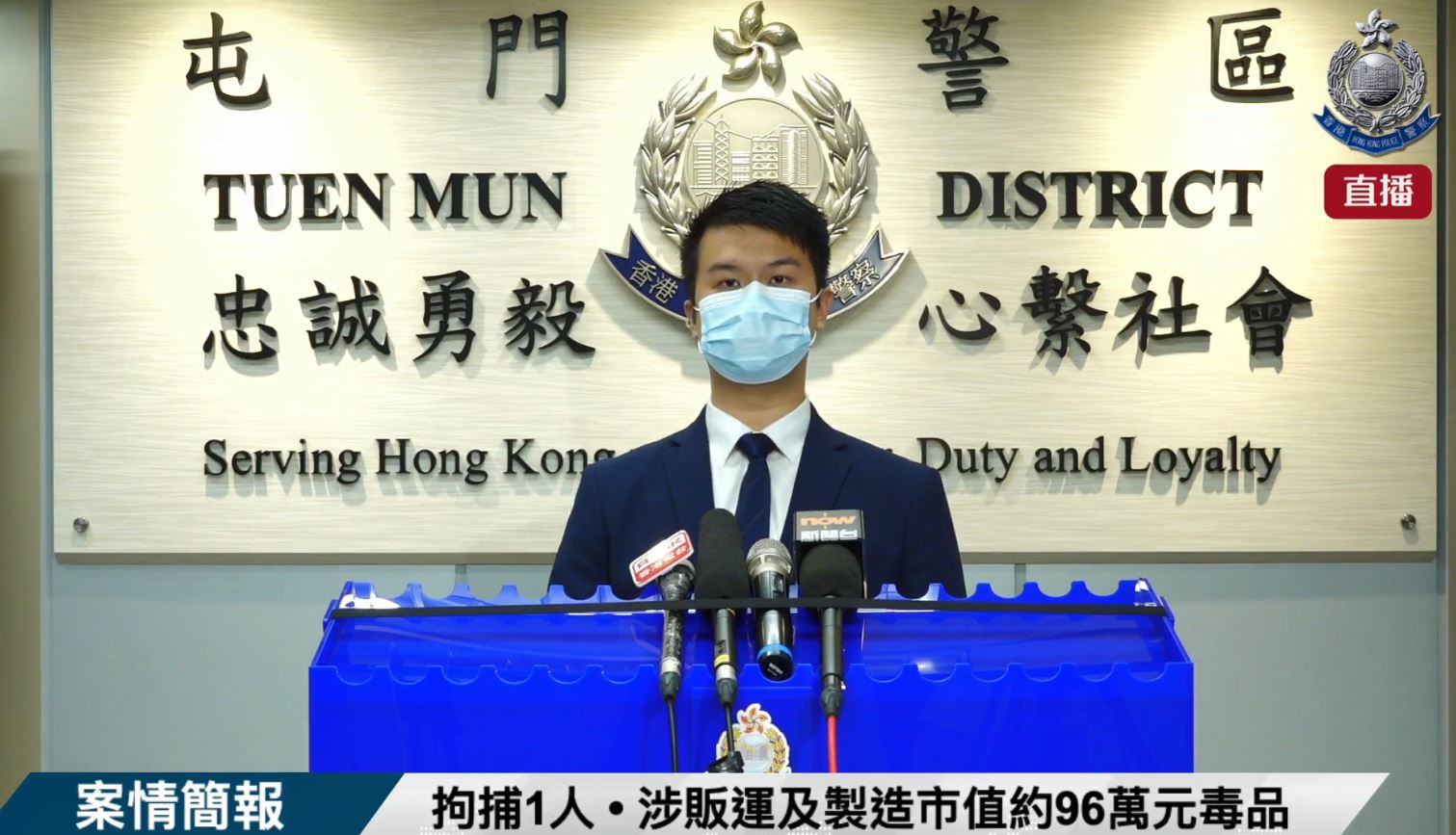 警方指,根據線報和深入調查,於昨日在屯門區展開反毒品行動。警方於掃管笏某住宅大廈截查一名可疑人士,在其身上搜出約214克懷疑霹靂可卡因,及後在其單位內檢獲337克懷疑霹靂可卡因和一批製毒工具,市值約96萬元。警方以「販運危險藥物」和「製造危險藥物」罪拘捕該名22歲男子。