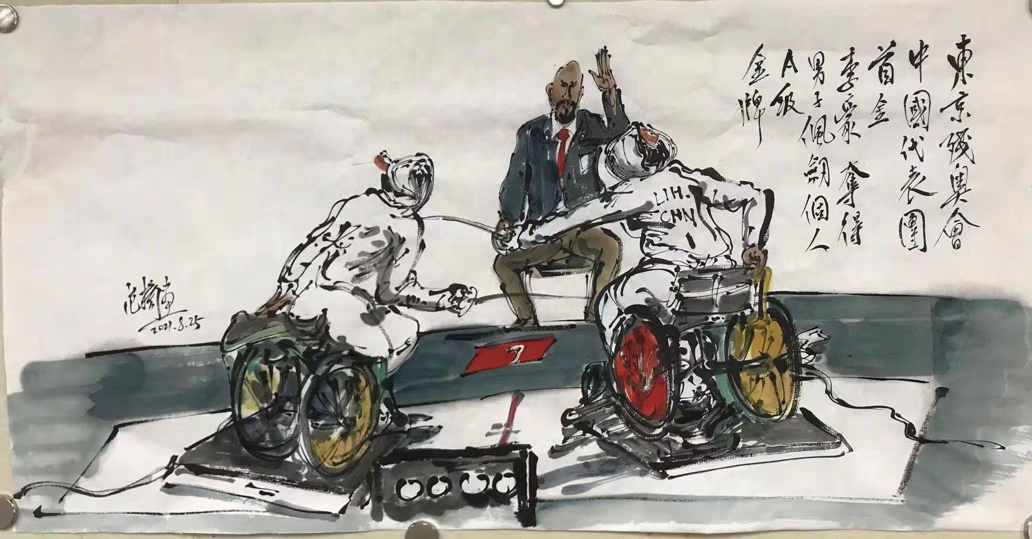 東京殘奧會開賽首日,中國隊李豪勇奪男子佩劍個人A級金牌。這也是中國隊的首金。著名畫家范揚揮毫記錄,將李豪奮勇奪金時刻傳神描繪於紙上。