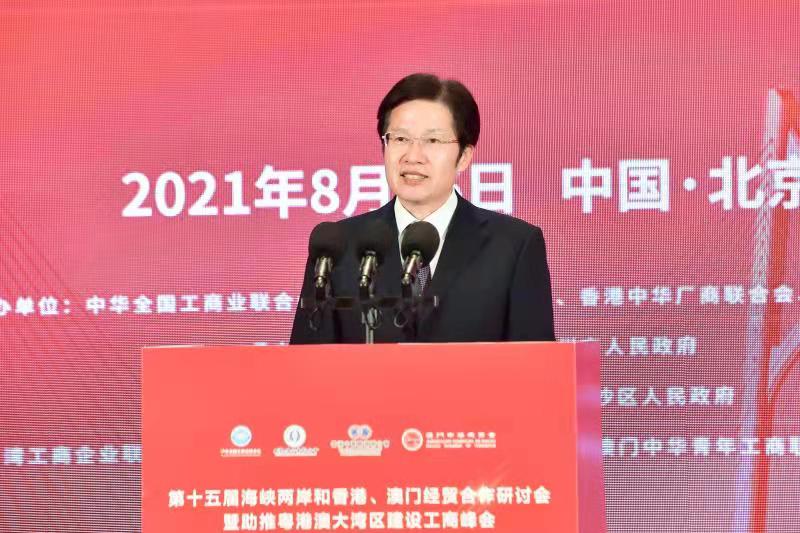 (大公文匯網記者 馬曉芳)由中華全國工商業聯合會、台灣工商企業聯合會、香港中華廠商聯合會、澳門中華總商會共同主辦的第十五屆海峽兩岸和香港、澳門經貿合作研討會暨助推粵港澳大灣區建設工商峰會26日召開。本次會議以「推進粵港澳大灣區科技創新合作,構建雙循環新發展格局」為主題,採用線下線上相結合形式舉辦,在北京、廣東、台灣、香港、澳門各設會場。全國政協副主席、全國工商聯主席高雲龍在致辭中強調,粵港澳大灣區作為引領國內外雙向開放的重要區域和高質量發展的重要示範區,在構建新發展格局中具有獨特的條件和優勢,海峽兩岸和港澳在科技創新方面各有優勢,交流合作大有可為。