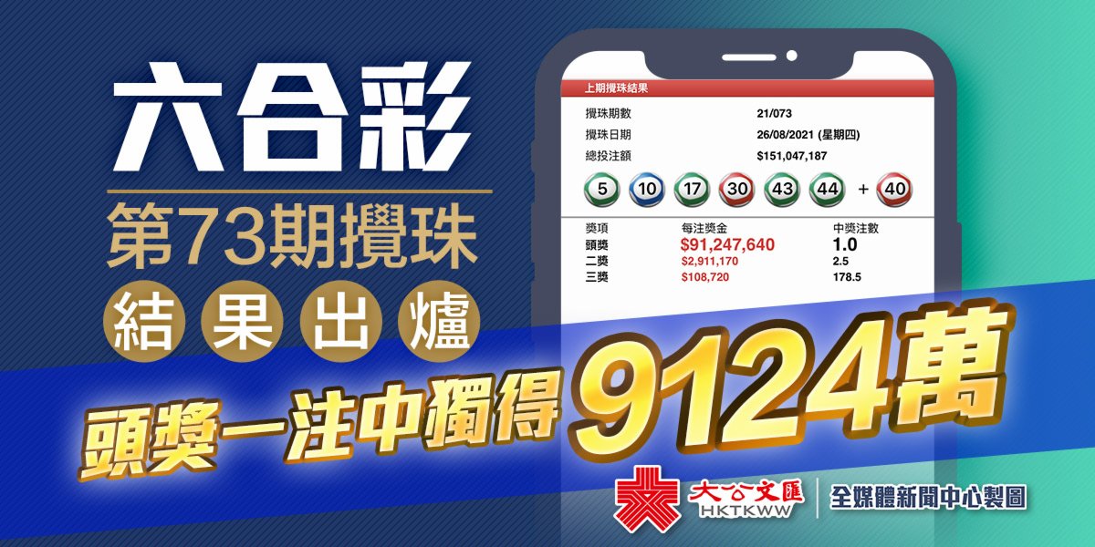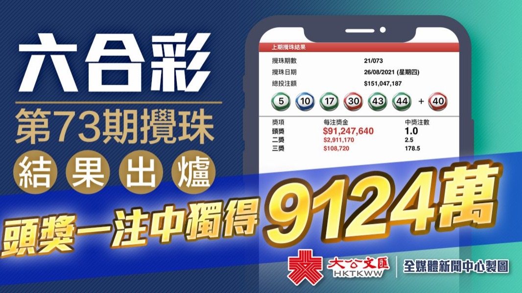 頭獎1注中,每注派91,247,640元;二獎2.5注中,每注派2,911,170元。下期六合彩將於本周六(28日)晚上攪珠,頭獎彩金800萬港元。
