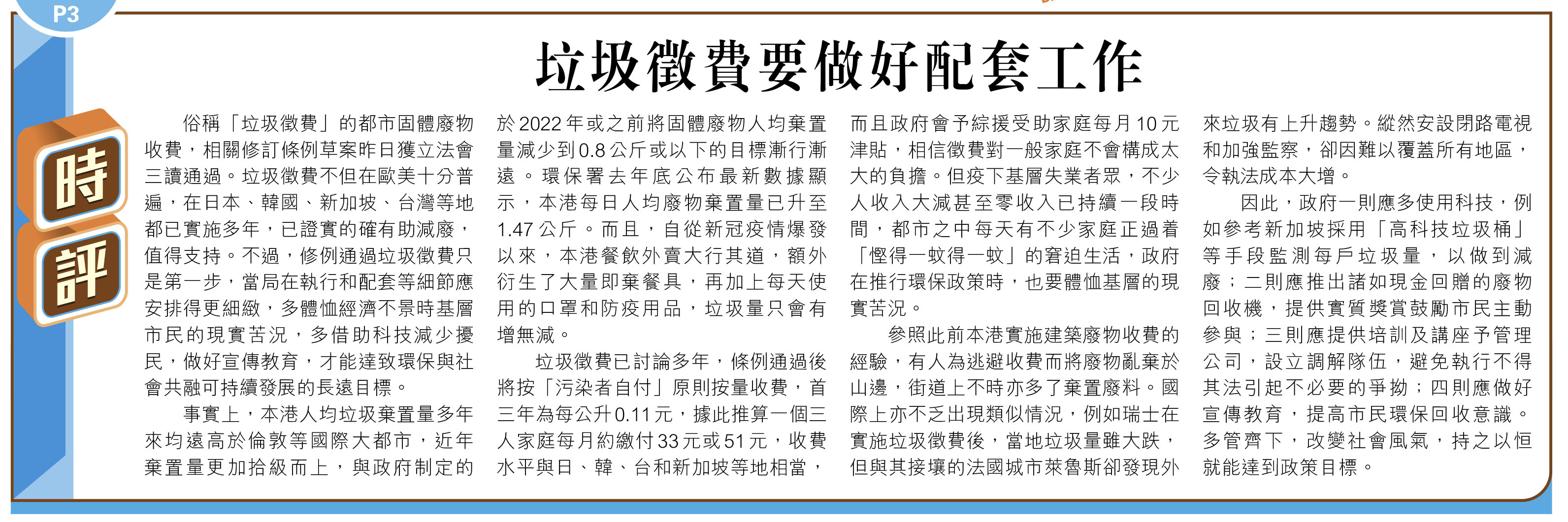 垃圾徵費已討論多年,條例通過後將按「污染者自付」原則按量收費,首三年為每公升0.11元,據此推算一個三人家庭每月約繳付33元或51元,收費水平與日、韓、台和新加坡等地相當,而且政府會予綜援受助家庭每月10元津貼,相信徵費對一般家庭不會構成太大的負擔。但疫下基層失業者眾,不少人收入大減甚至零收入已持續一段時間,都市之中每天有不少家庭正過着「慳得一蚊得一蚊」的窘迫生活,政府在推行環保政策時,也要體恤基層的現實苦況。