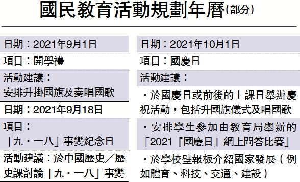 為豐富學生的學習經歷,教育局於新學年舉辦「2021『國慶日』網上問答比賽」,讓學生加深認識國家歷史、文化及國情,《憲法》、《基本法》和國家安全,從而提升國民身份認同。該活動被列入「活動策劃年曆」中。比賽分小學組和中學組,採用網上形式進行,每校參賽人數不限,比賽題目以中、英文雙語模式顯示,比賽時間為9月27日至10月5日。