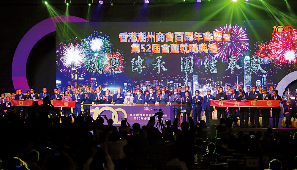 (大公報記者 龔學鳴 馬丁)香港潮州商會百周年會慶暨第52屆會董就職典禮昨日於灣仔會展中心舉行,香港特區行政長官林鄭月娥、駐港國家安全公署署長鄭雁雄、中央駐港聯絡辦副主任何靖、外交部駐港特派員公署副特派員方建明、香港特區政府財政司司長陳茂波等作為主禮嘉賓出席活動。