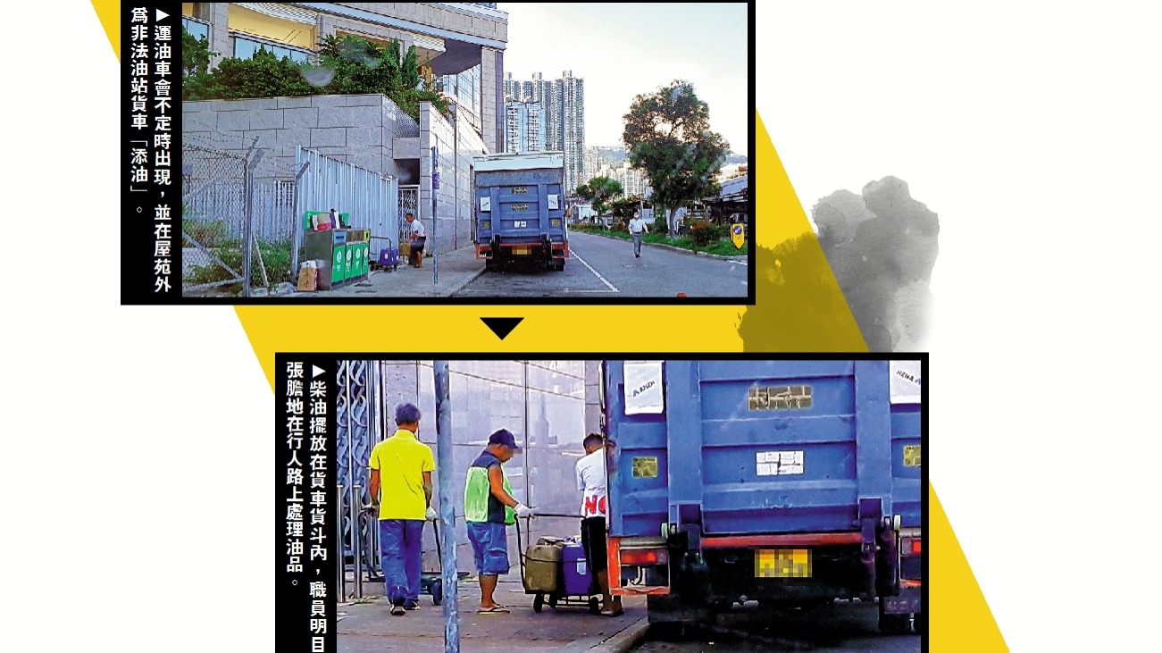 大公報記者連日調查,發現該非法油站位於鴨脷洲海旁道末端、近海邊位置,以一輛白色5.5噸密斗貨車做掩飾,貨斗內儲存多個高達1.5米的油桶,每個油桶若至少儲存200公升油渣計算,單單擺放五個油桶,貨斗內已有超過一噸油渣。