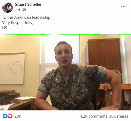 英國《衛報》提到,斯圖爾特·舍勒於當地時間26日在其個人臉書、領英上發布了這段自述視頻。福克斯新聞網稱,視頻中,這名為美國海軍陸戰隊工作了17年的當事人,提到了美國防長奧斯汀、美軍最高將領兼美國參謀長聯席會議主席馬克·米利等軍隊高層人士。