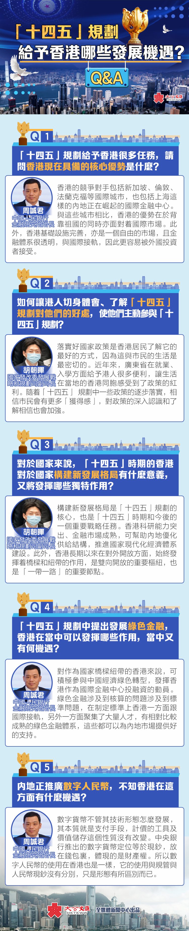 胡朝暉將「十四五」規劃直接惠及香港的領域概括為「一個提升、兩個融入」。「一個提升」,即提升香港的競爭優勢。「十四五」規劃明確提出,支持香港鞏固國際航運、金融、貿易中心和國際航空樞紐地位,建設國際創科中心、成為亞太區國際法律及爭議解決的服務中心、區域知識產權的交易中心、建設中外文化交流中心,包括支持向服務業向高端方向發展等。