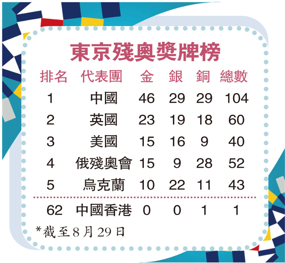 截至29日,中國軍團已在今屆殘奧奪得46金29銀及29銅,金牌總數與獎牌總數遠遠拋離對手,一枝獨秀。