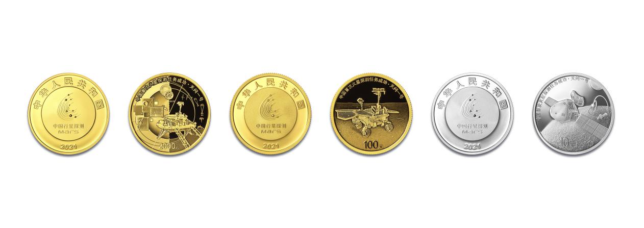 中國首次火星探測天問一號任務「祝融號」火星車駛上火星表面滿100天之際,國家航天局聯合中國人民銀行在京舉辦中國首次火星探測任務成功金銀紀念幣發行儀式,以紀念中國成功邁出星際探測征程的重要一步,在火星上首次留下中國的印跡,成為世界首個一次任務實現火星環繞、着陸和巡視的國家。紀念幣為中華人民共和國法定貨幣,由中國人民銀行發行,共3枚,包括金幣2枚、銀幣1枚。正面圖案均為中國行星探測標識,並刊國名、年號「2021」,背面圖案分別以首次火星探測任務「繞、着、巡」為主題,並刊「中國首次火星探測任務成功·天問一號」及面額,這也是中國第7套航天題材金銀紀念幣。