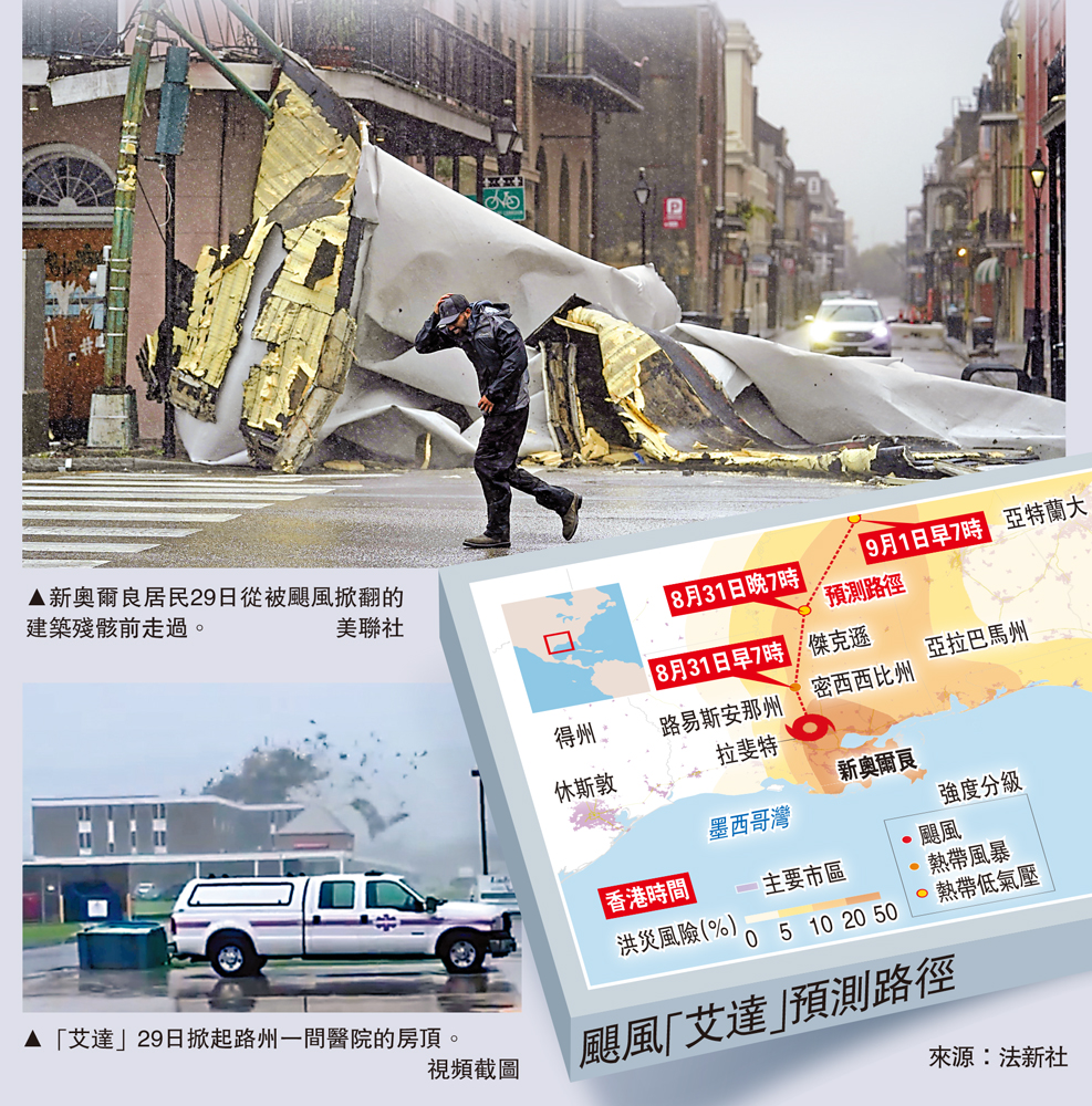 大公報綜合美聯社、美國有線電視新聞網、《紐約時報》報道:4級颶風「艾達」在「卡特里娜」風災16周年之際登陸美國路易斯安納州,令當地居民重溫噩夢,美國總統拜登29日宣布路州進入「重大災難」狀態。路州在經歷「卡特里娜」颶風後升級了防洪堤系統,但「艾達」依然造成巨大破壞:至少一人死亡,數百人被洪水圍困,新奧爾良全城斷電。有分析指,「卡特里娜」重創時任美國總統小布什民望,拜登如今面臨新冠疫情、阿富汗撤軍和風災三重挑戰,政治生涯陷入嚴重危機。