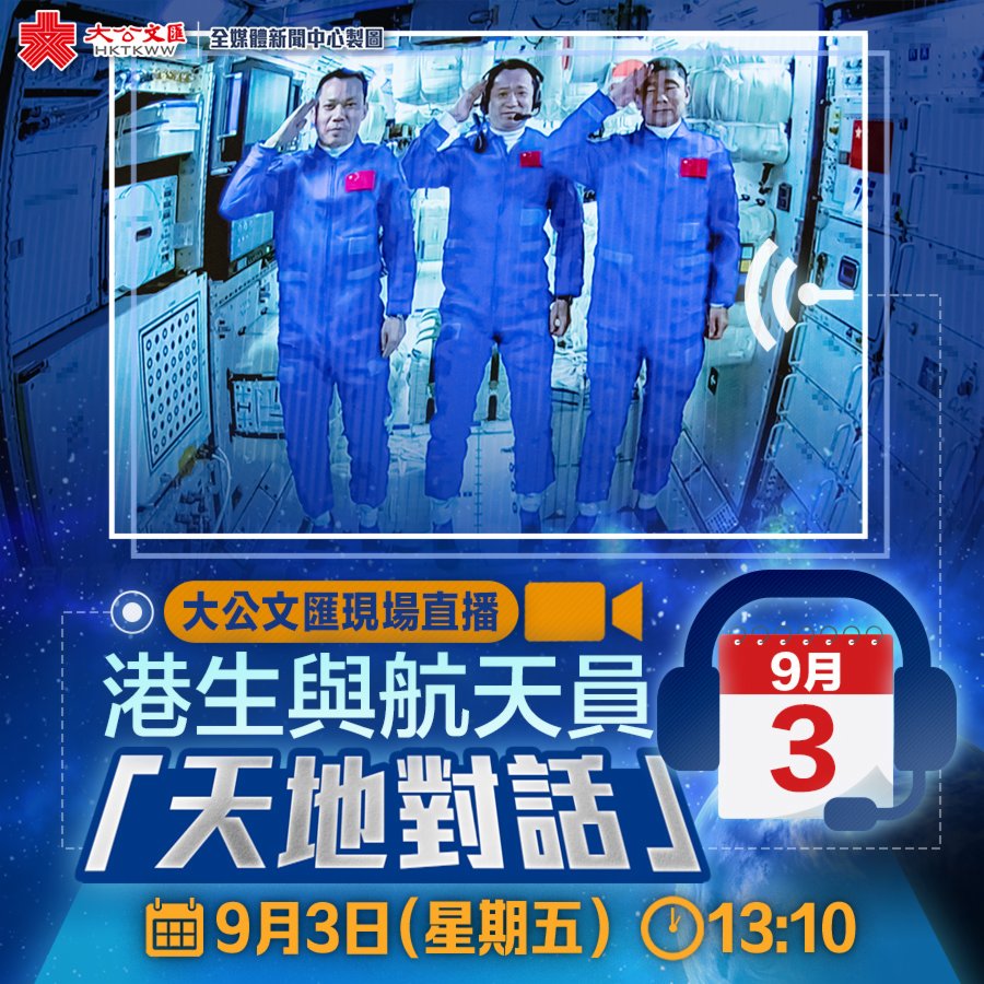 活動將於本周五中午1點10分開始,歷時約1個半小時,除了與航天員「天地對話」外,還邀請到國家航天專家與香港青少年進行實時連線交流。大公文匯全媒體會通過網站、大公文匯全媒體YouTube頻道進行現場直播,敬請關注!
